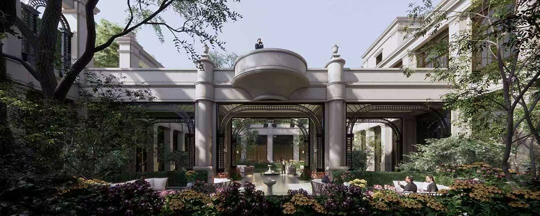 汲取伦敦老牌豪宅区切尔西公寓建筑立面灵感,传承并以现代建筑语言转译18世纪的乔治亚风格建筑,呈现严谨的对称与精致的细节,赋予建筑秩序之美;“三段式”黄金分割比例,与源自巴黎旺多姆广场灵感的线条肌理,构筑城市封面级的建筑标杆。