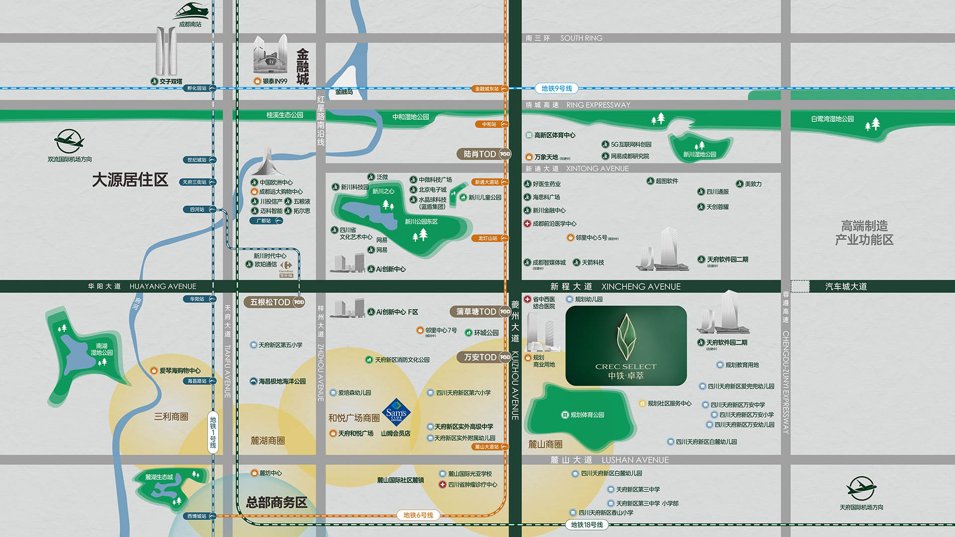 新川南,作为城南双核新质住区,双轴交汇双心集萃,北承高新区金融城、大源的成熟配套与产业势能,南接天府中央法务区、天府总部商务区的未来规划,形成北享繁华、南握机遇的独特区位优势。