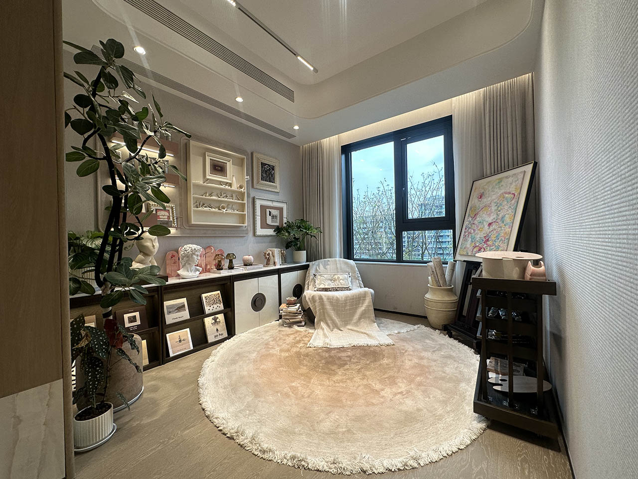 约40-50m²的空中花园,承载的功能比普通景观阳台更丰富,可以是品茗区,加上锦鲤池设置,也可以设计成儿童乐游乐园,搭乐高、玩积木、画画。还可以做成花园读书角,客厅以外的第二待客区,为生活增添乐趣。